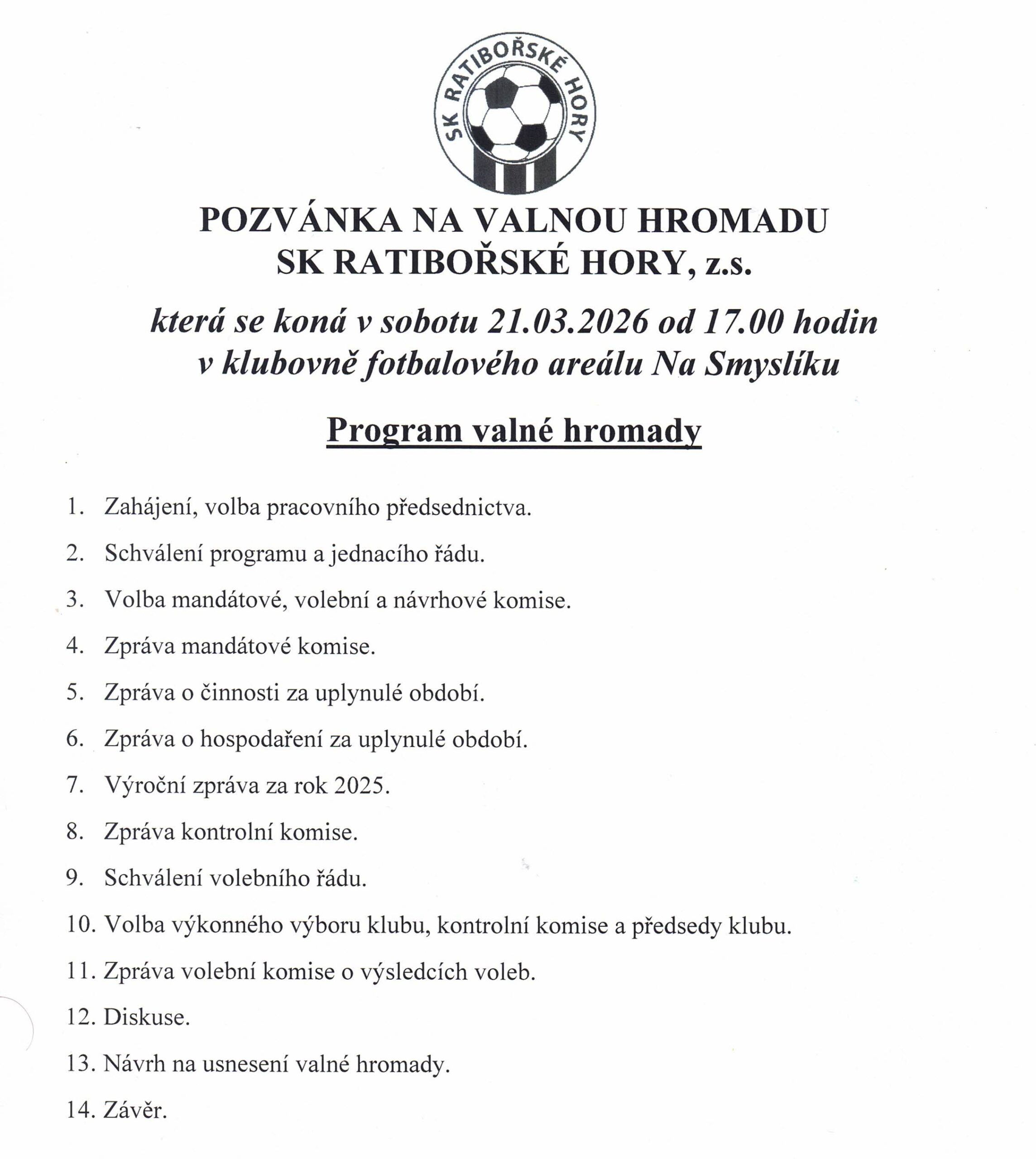 Valná hromada SK Ratibořské Hory, z.s. 21.03.2026