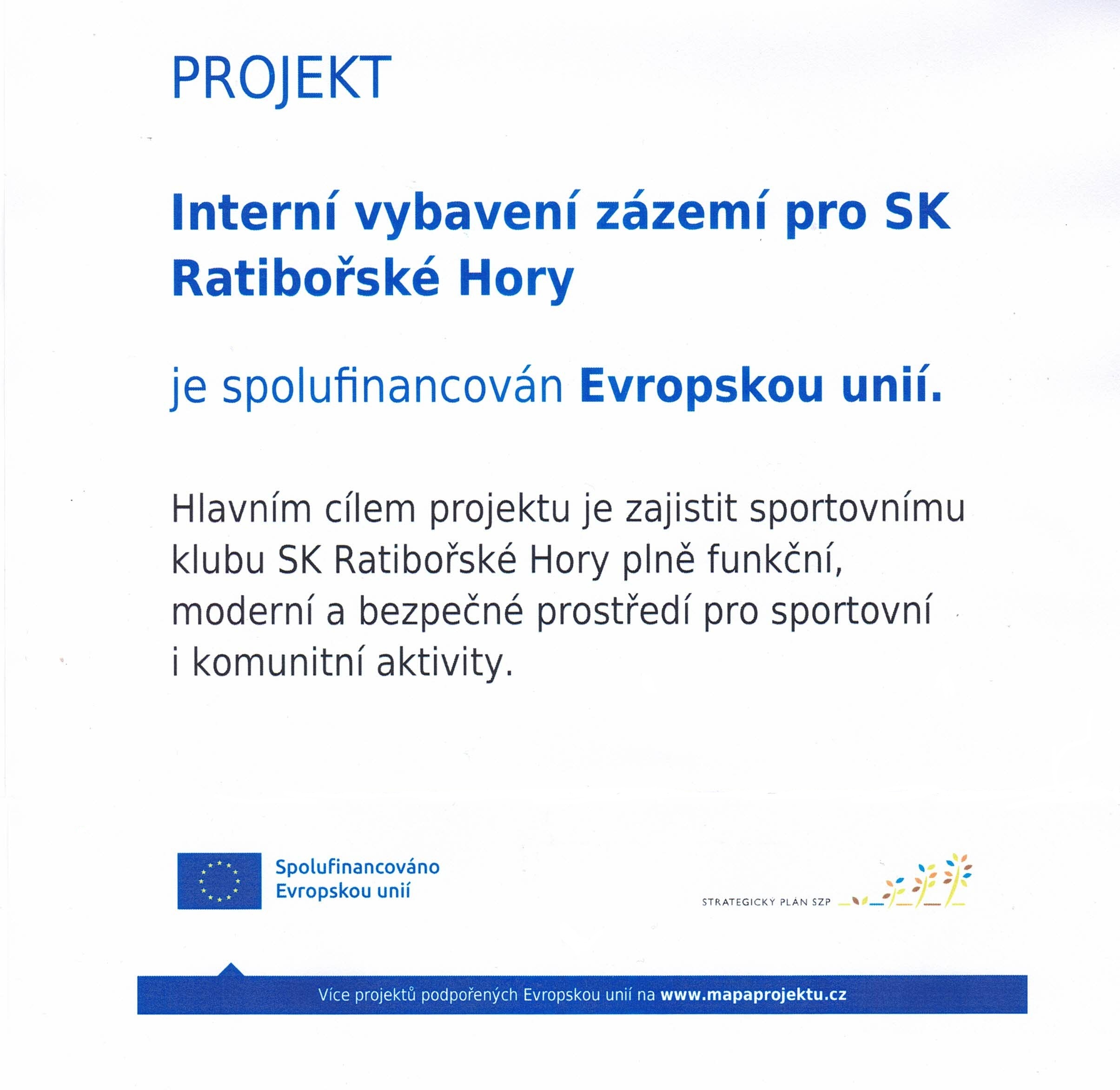SK Ratibořské Hory završuje modernizaci svého sportovního zázemí vybavením nové budovy díky projektu s názvem „Interní vybavení zázemí pro SK Ratibořské Hory“ podpořeného z Evropské unie za spolupráce MAS Krajina srdce. Projekt je součástí Strategického plánu Společné zemědělské politiky.